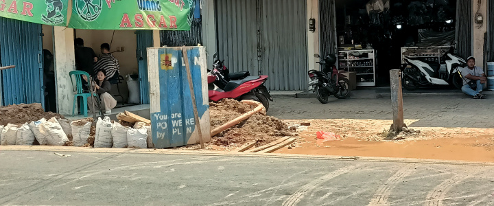 Dari pantauan di lokasi, terlihat sejumlah karung berisi tanah dan material galian ditumpuk di tepi jalan. Kondisi tersebut membuat sebagian badan jalan menjadi kotor dan licin sehingga pengendara harus lebih berhati-hati saat melintas, terutama pengendara sepeda motor.